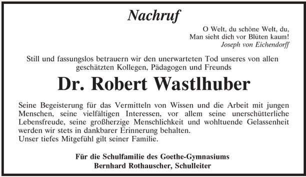 Wenige Tage später erreichte uns zudem die Nachricht aus Regensburg, dass unser ehemaliger Kollege Robert Wastlhuber, der viele Jahre am WGG unterrichtete und nun seit längerem Seminarlehrer für Chemie am Goethe-Gymnasium Regensburg war, völlig unerwartet und plötzlich verstorben ist.